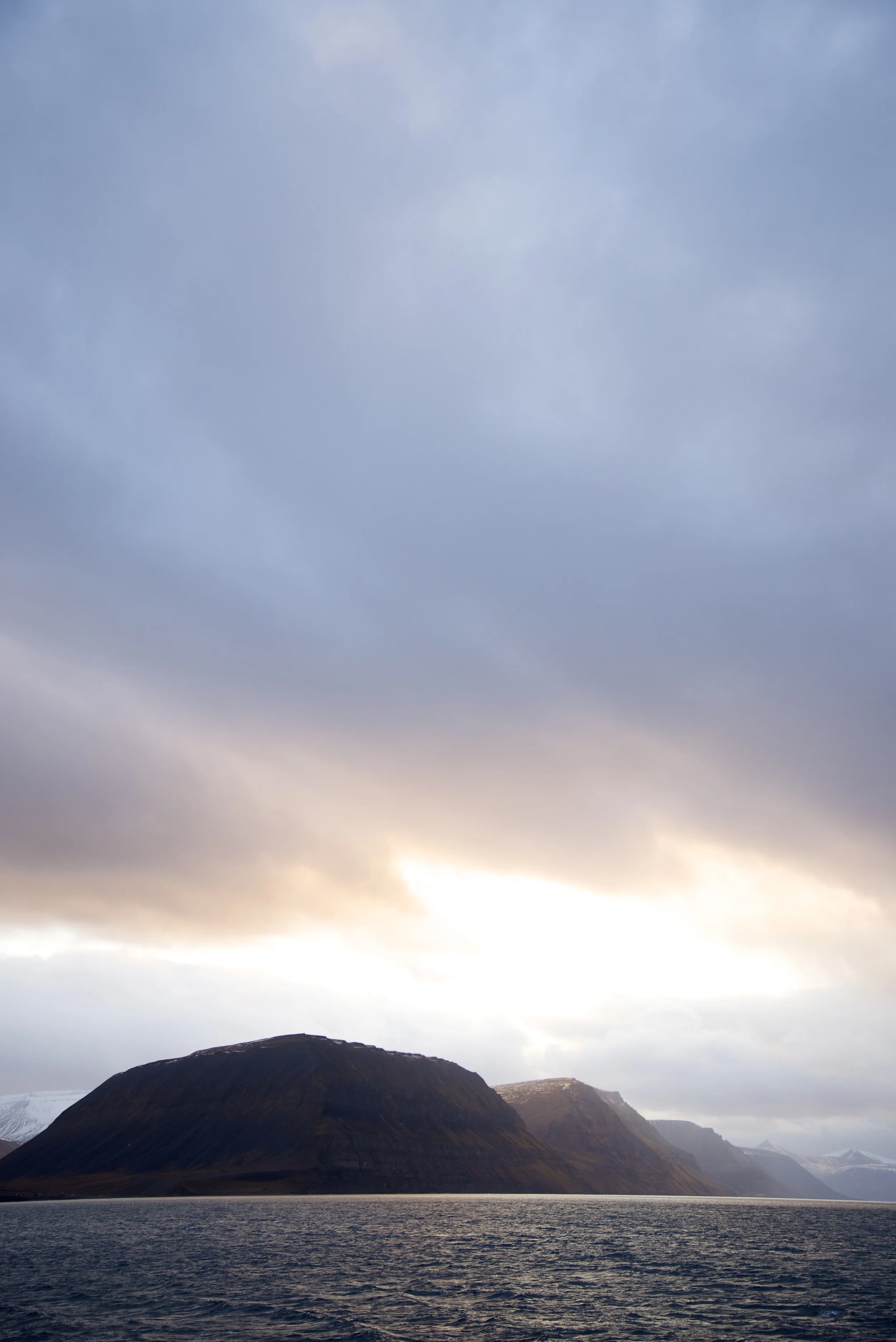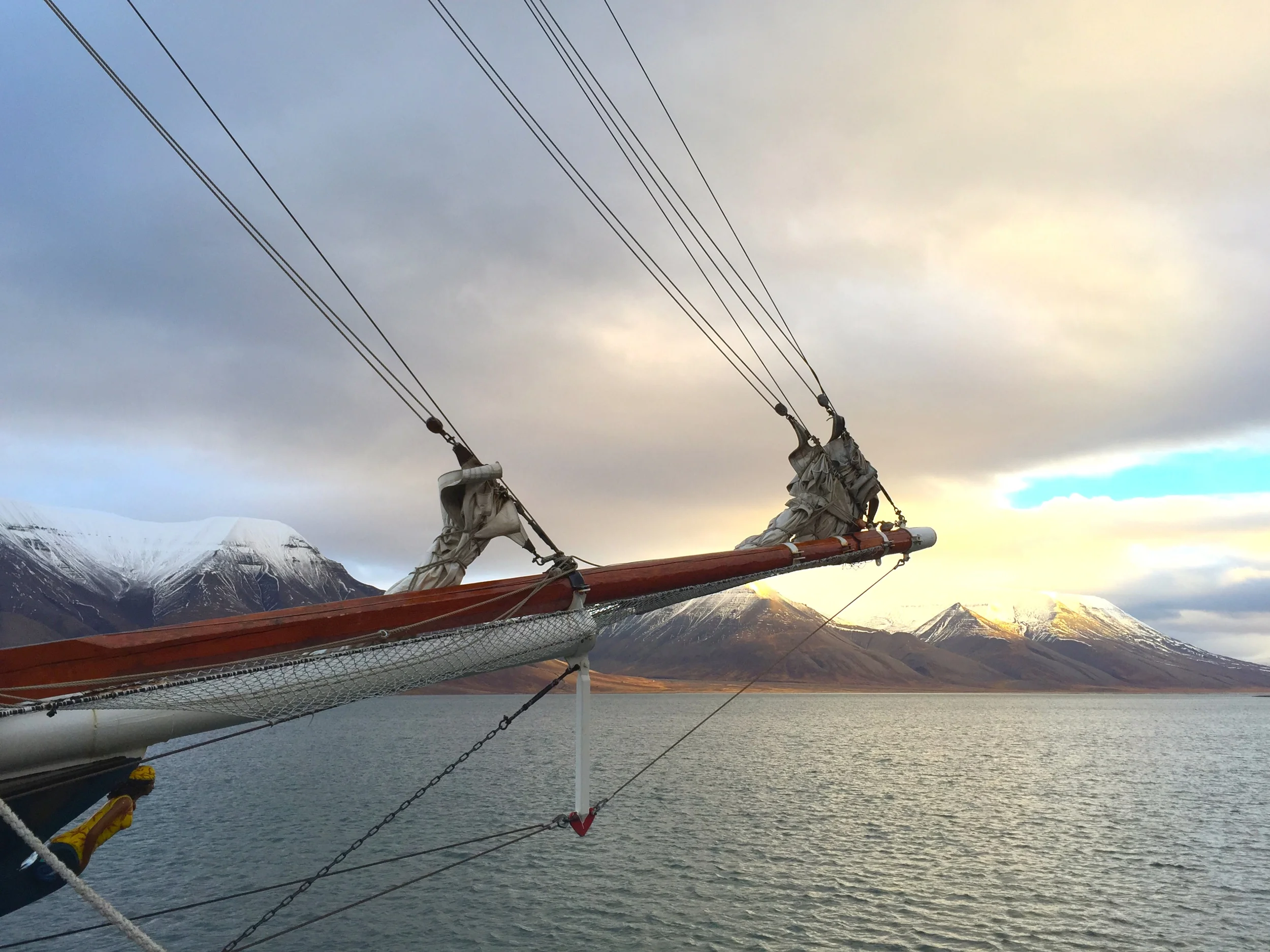 I have been completely sedentary today. I skipped the morning landing to make some melting ice experiments on the ship. In the afternoon, we put up the sails for the first time and were propelled only by the pure wind in the everlasting sunset. It powered us over the northwest curve out of Raudfjorden that brought us to the northernmost point of our expedition (79.5º),then we began to head back south. The white turned pink and the summits erupted flaming orange and yellow shafts of light. It was magical.