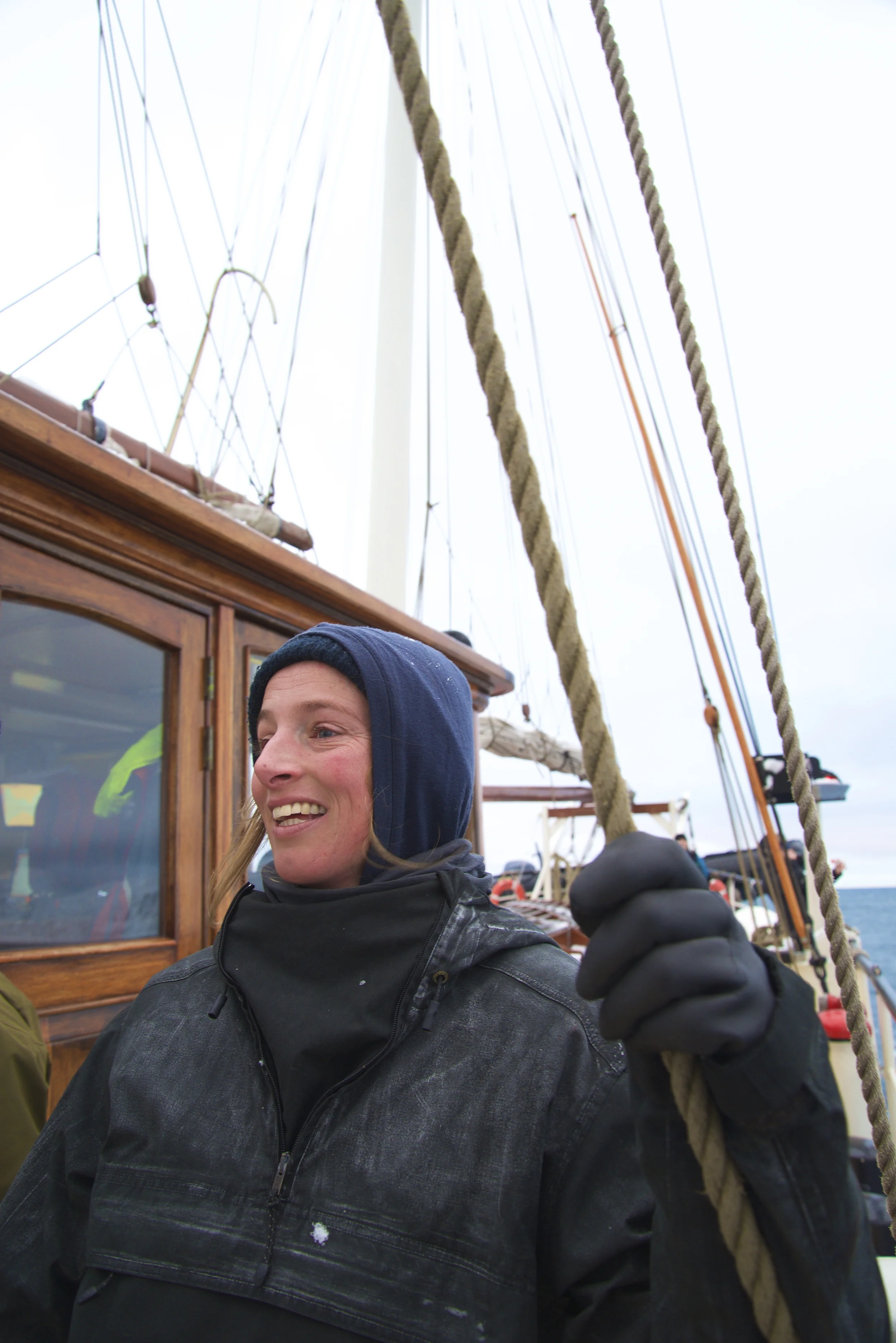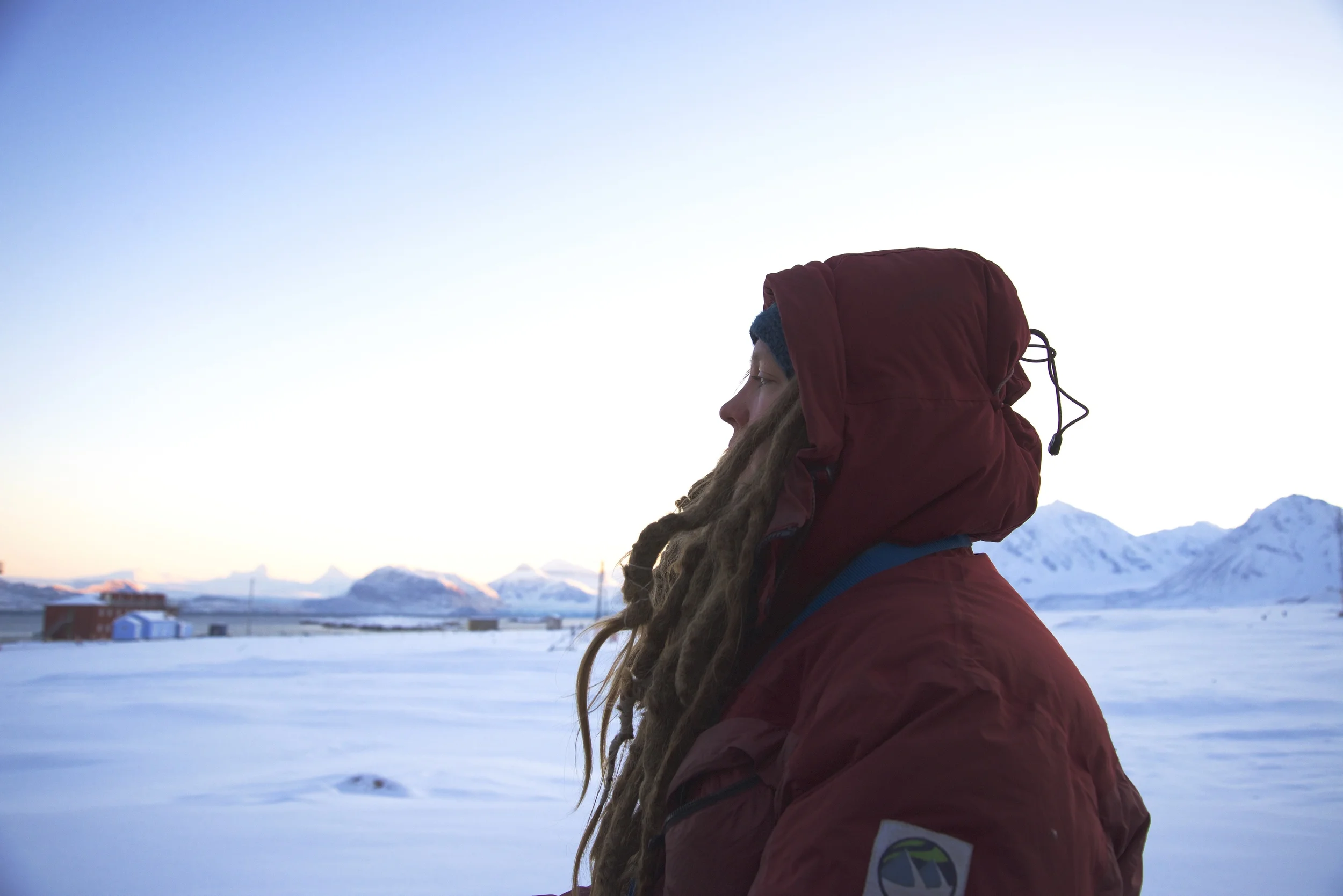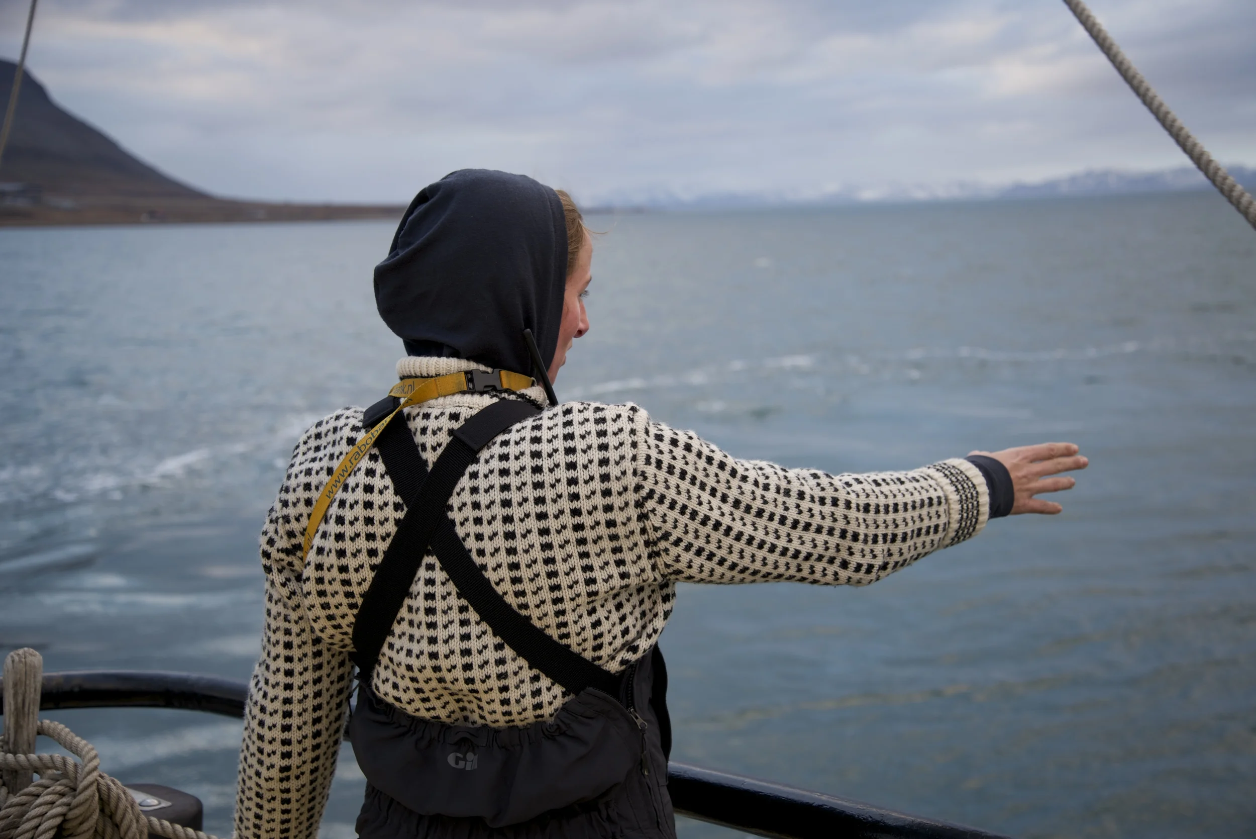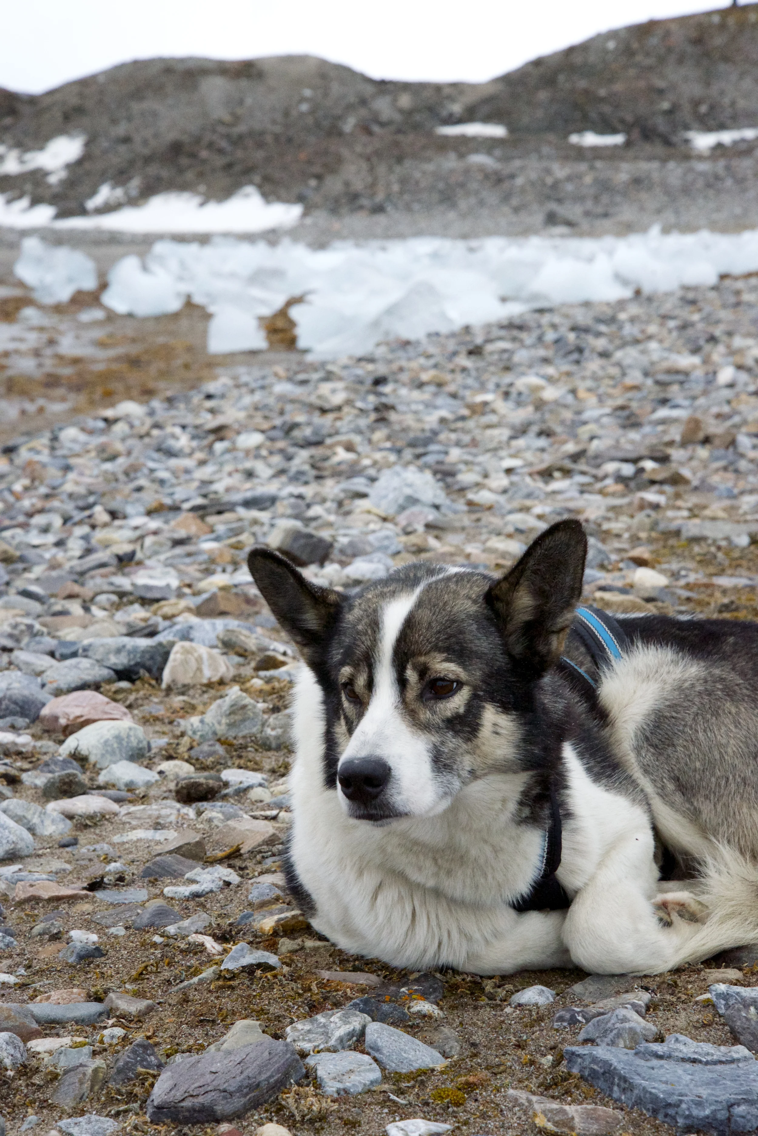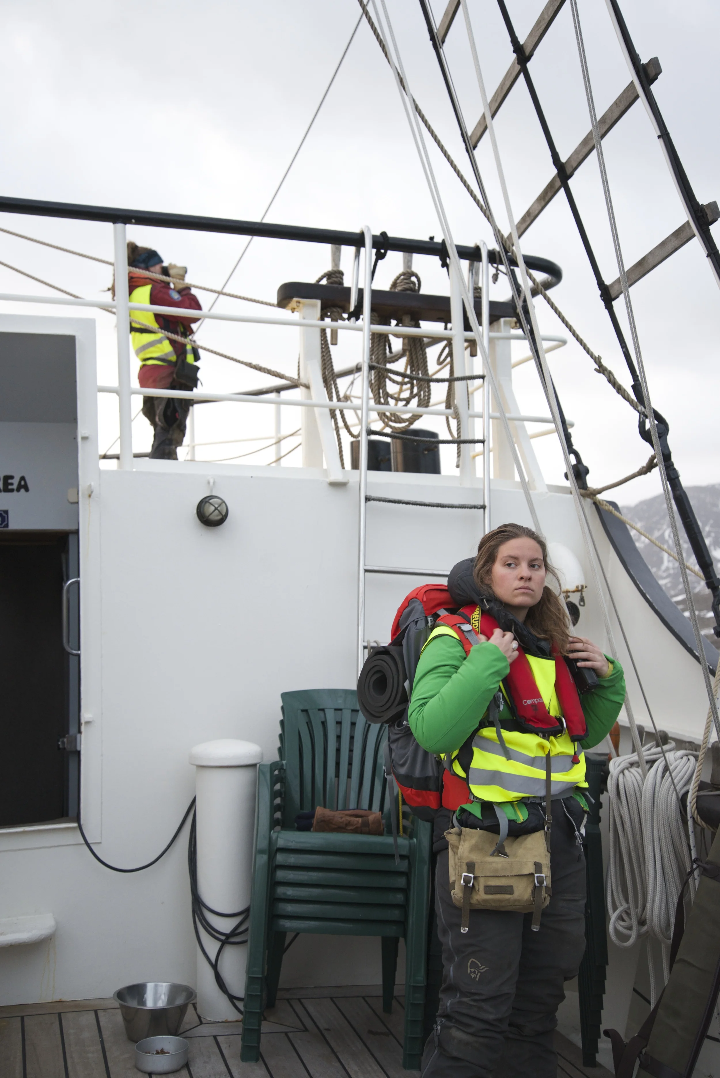 Our guides are Åshild from Norway whose boyfriend lives in Ny Ålesund, a scientific research village north of Longyearbyen. She shyly tells us stories about trappers and explorers whose lives have been claimed by various Arctic perils, and makes Power Point presentations about polar bears. Sally is from Denmark and finally moved permanently to Longyearbyen after several years of denying its magnetism. She is gentle and funny and has a reindeer onesie. Theres from Sweden is the Expedition Leader. She was 15 the first time she saw a mountain and it changed her forever. Her blond dreadlocks emerge from a permanent wool headband and descend to her waist. Sarah from the Netherlands is the Program Coordinator. She leads Arctic hikes in a denim miniskirt and sleeps in a sleeping bag on the deck with her Husky, Nemo. Her rosy cheeks always match the hue of her hair and her voice is like a church bell, only soft. Each one wields a giant shotgun with ease while standing for hours in sub-zero temperatures to protect this motley crew of artists from potential polar bear attacks. I am proud to know these extraordinary women and am enamored with each one of them.