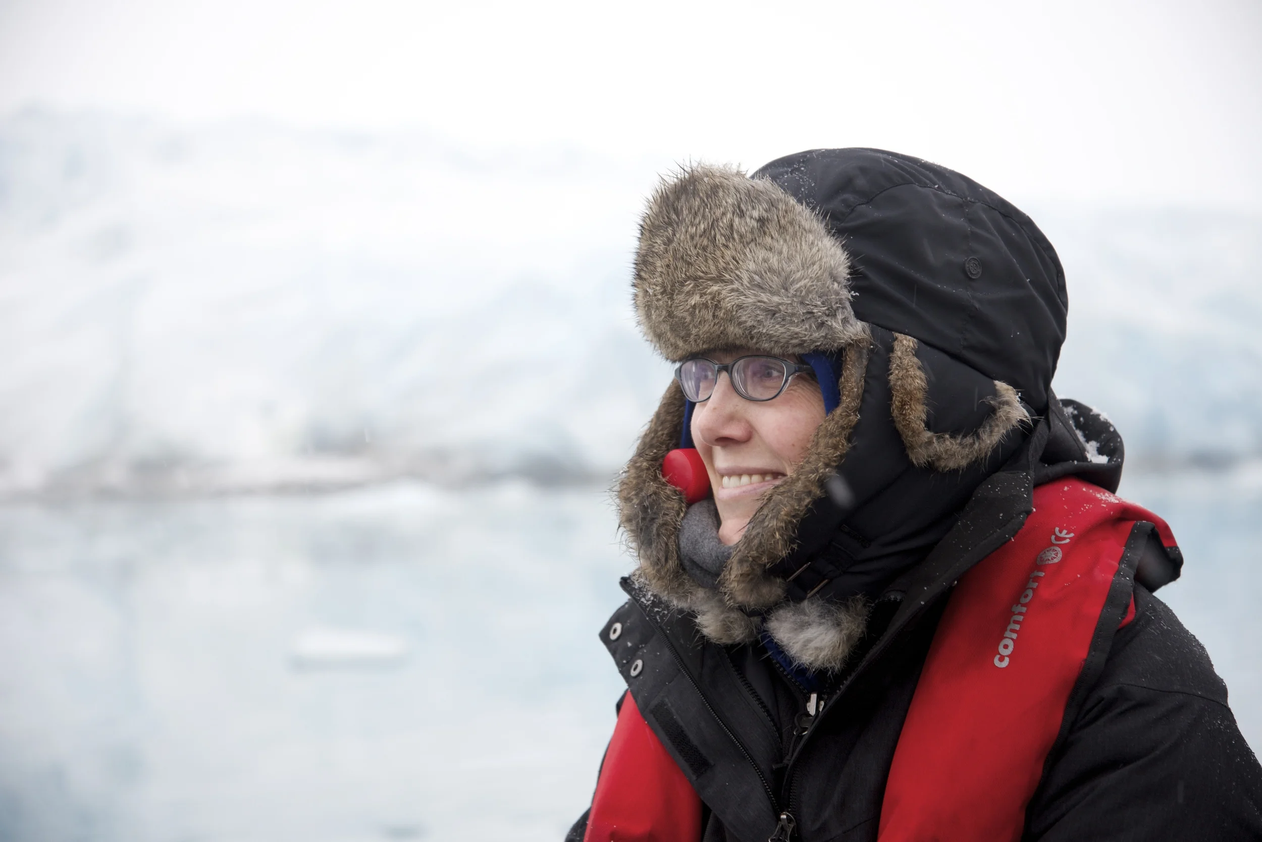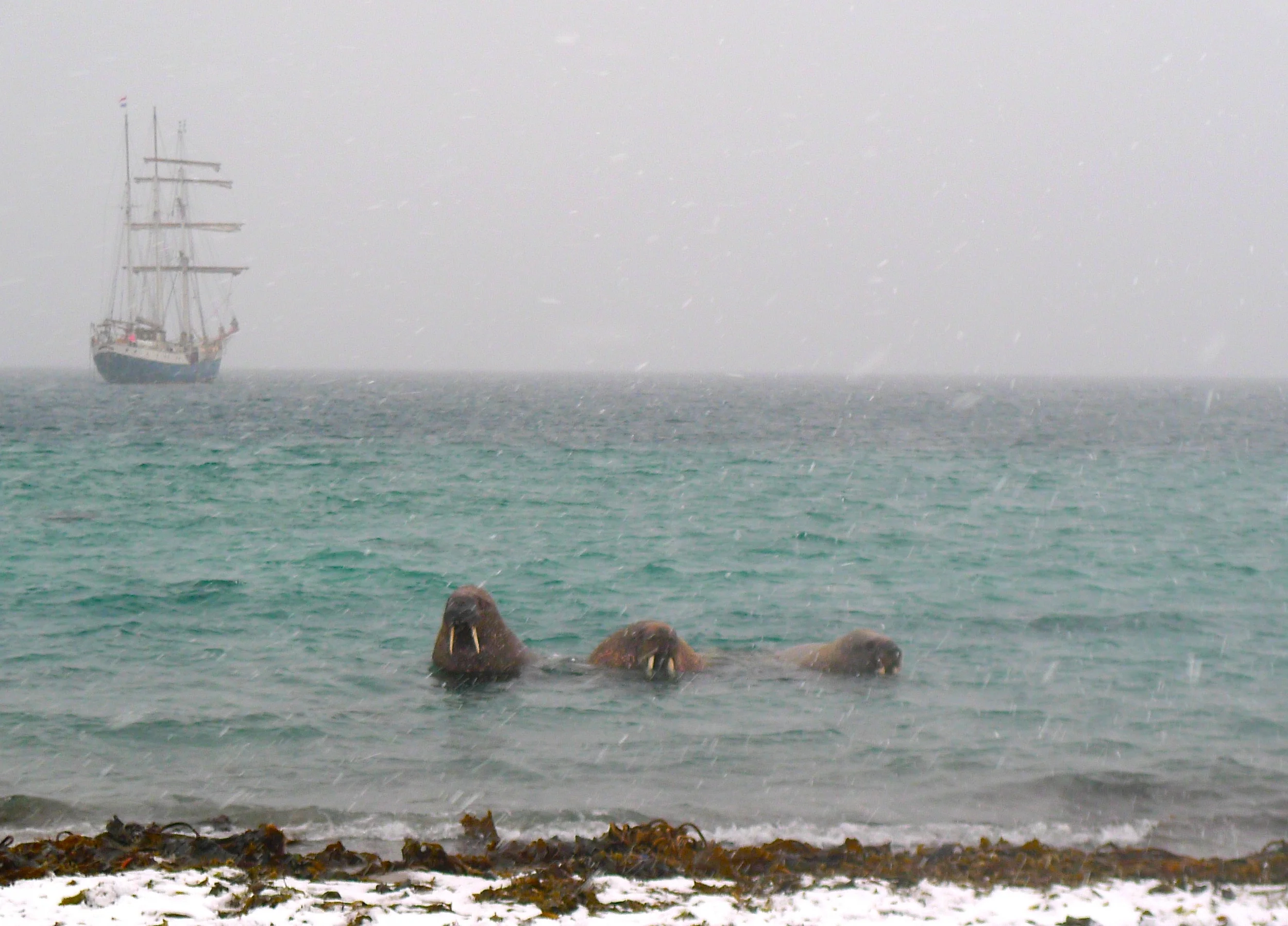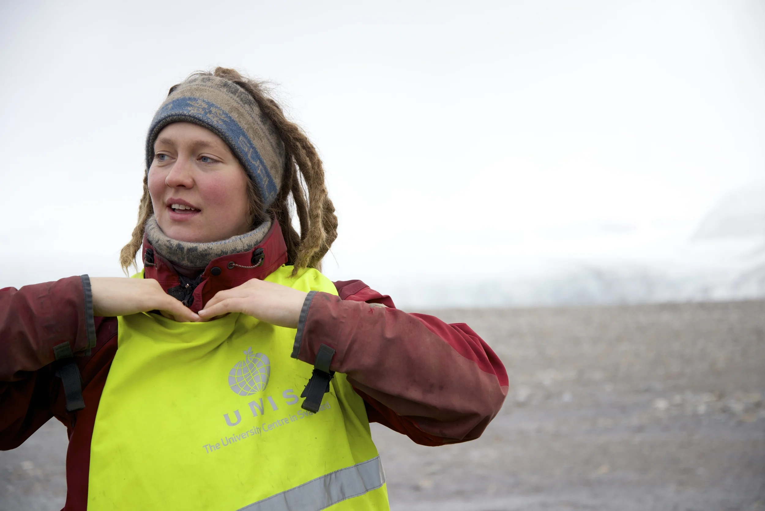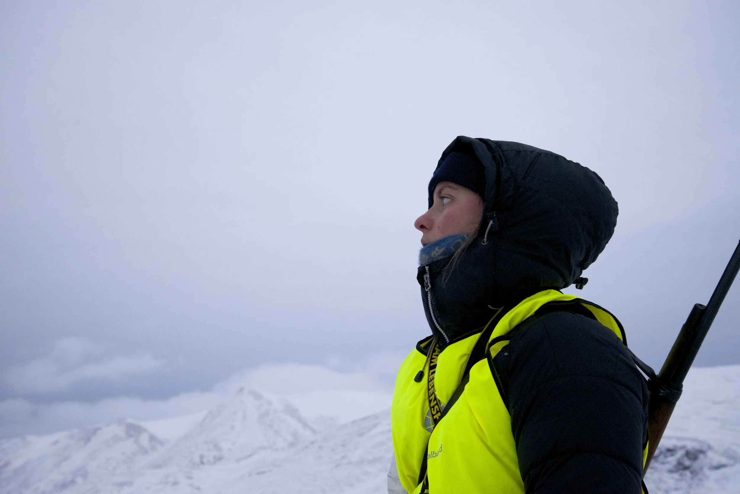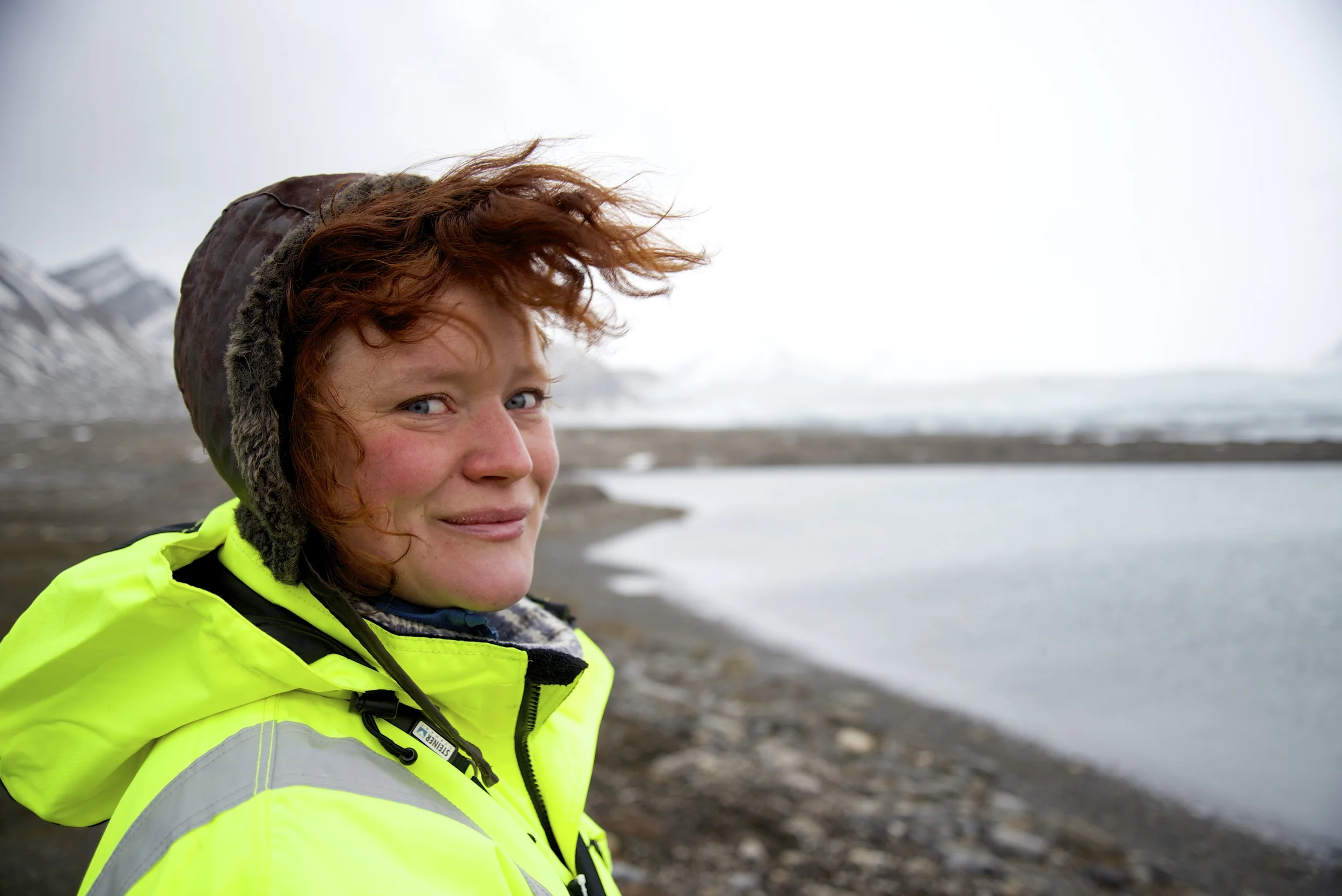 Our guides are Åshild from Norway whose boyfriend lives in Ny Ålesund, a scientific research village north of Longyearbyen. She shyly tells us stories about trappers and explorers whose lives have been claimed by various Arctic perils, and makes Power Point presentations about polar bears. Sally is from Denmark and finally moved permanently to Longyearbyen after several years of denying its magnetism. She is gentle and funny and has a reindeer onesie. Theres from Sweden is the Expedition Leader. She was 15 the first time she saw a mountain and it changed her forever. Her blond dreadlocks emerge from a permanent wool headband and descend to her waist. Sarah from the Netherlands is the Program Coordinator. She leads Arctic hikes in a denim miniskirt and sleeps in a sleeping bag on the deck with her Husky, Nemo. Her rosy cheeks always match the hue of her hair and her voice is like a church bell, only soft. Each one wields a giant shotgun with ease while standing for hours in sub-zero temperatures to protect this motley crew of artists from potential polar bear attacks. I am proud to know these extraordinary women and am enamored with each one of them.