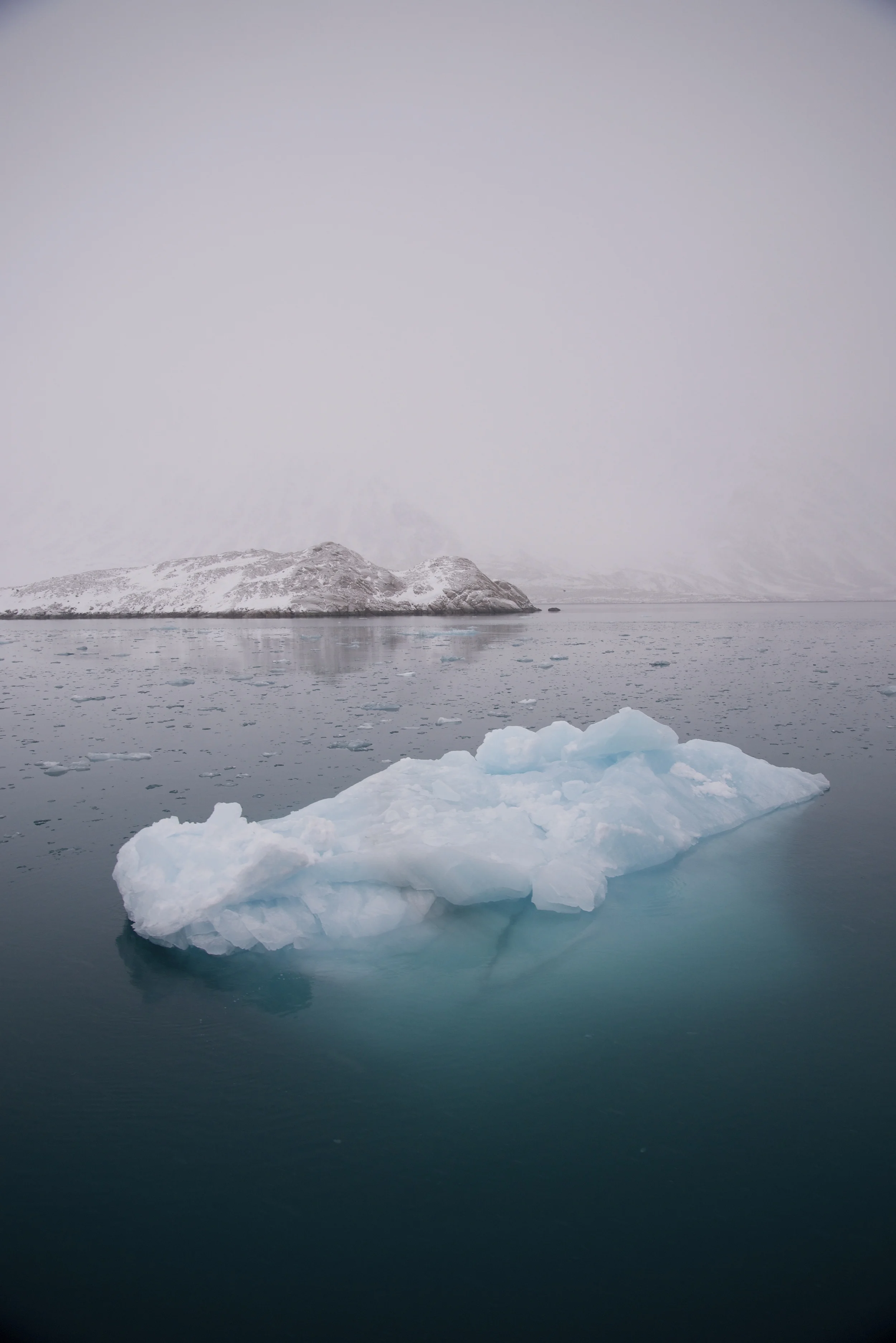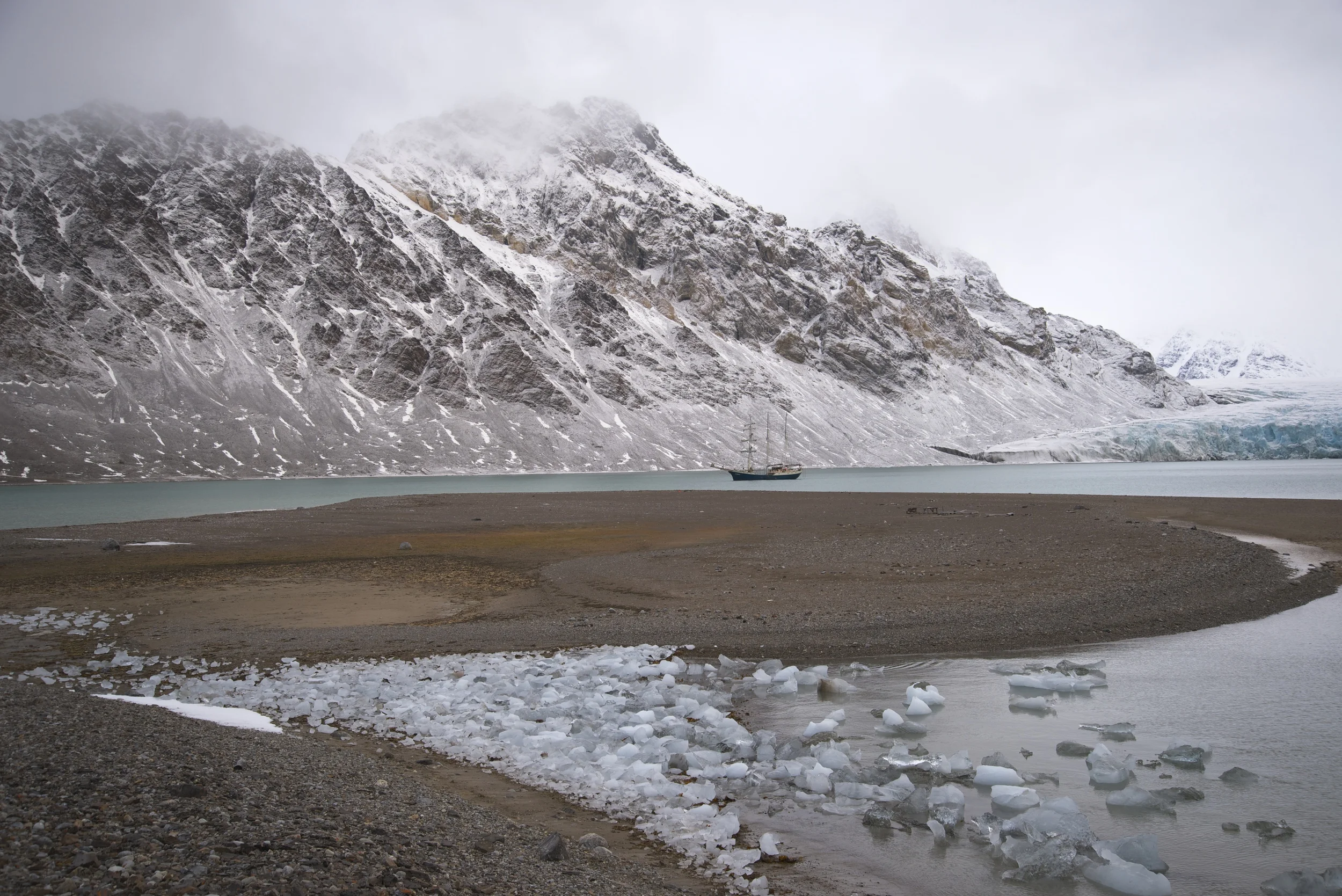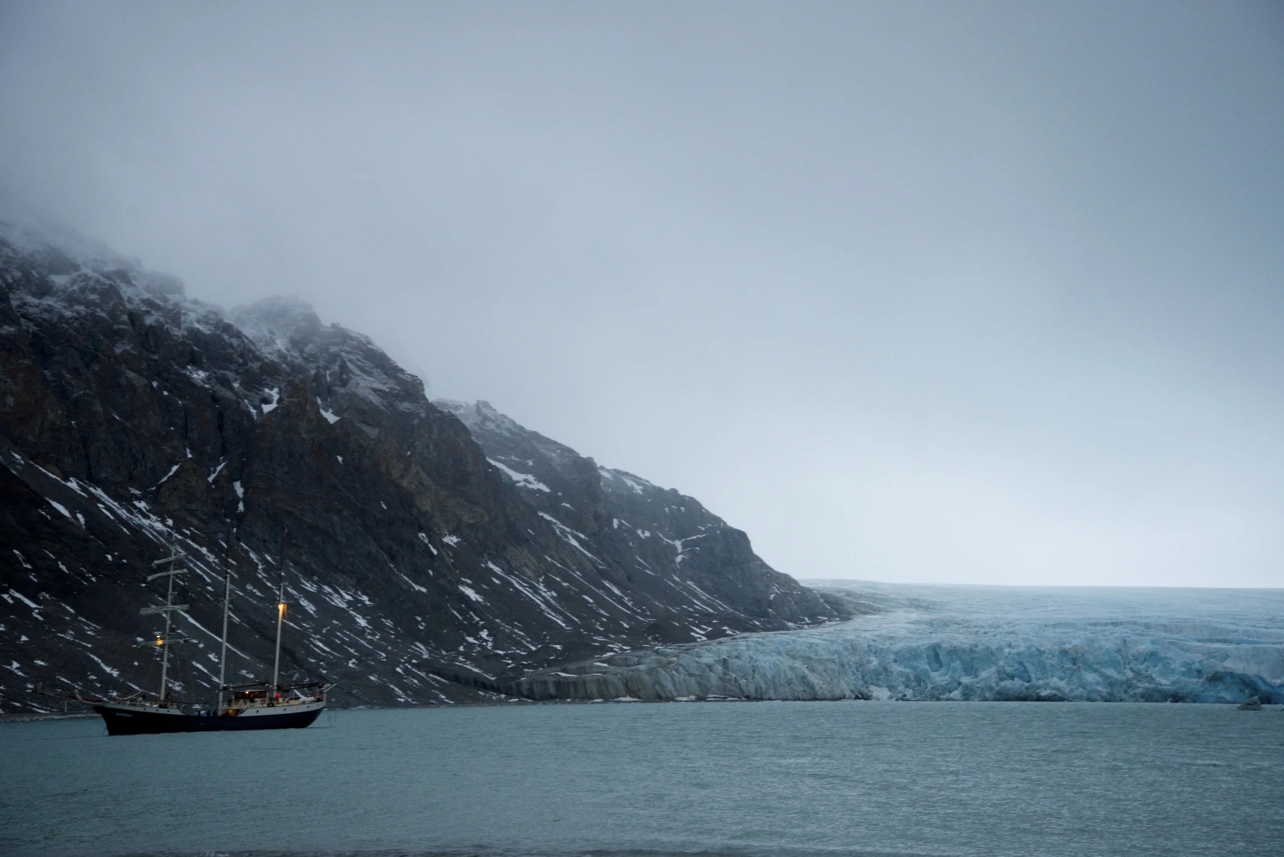 It was clear immediately that the next two weeks are going to be a visual field of expanding and contracting landscapes. As Longyearbyen shrank, the mountains on the facing side of Isfjorden dilated. They were castles of perfectly punctuated patterns of erosion. After a session of learning to rotate ballasts and lower sails and a treacherous crossing of the Isfjorden (ok, not treacherous, but utterly nausea-producing), we made our way into Ymerbukta, a smaller sub-fjord that protrudes from the northern edge of Isfjorden. The light was barely there, but barely is enough to illuminate ice. Esmarkbreen, a massive glacier that crowded the coast in a frozen tumble to the sea, came into focus at the end of the fjord. It was mesmerizing. And it was calving. We glided silently among the floating blocks and slabs and lumps of ice until we were close enough to see a gradient of blue and white, and inky black in its deep fissures. I've never experienced anything like it.