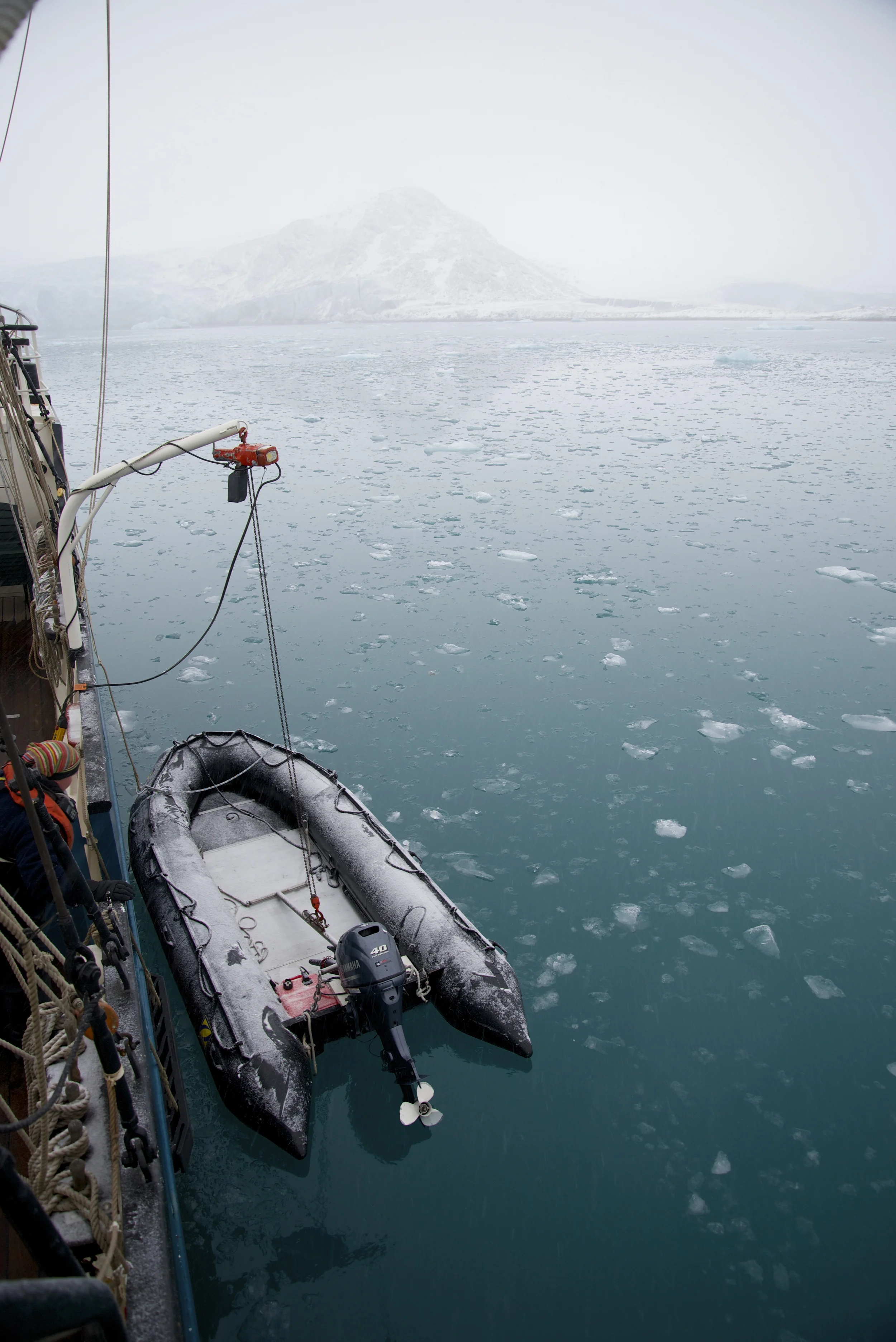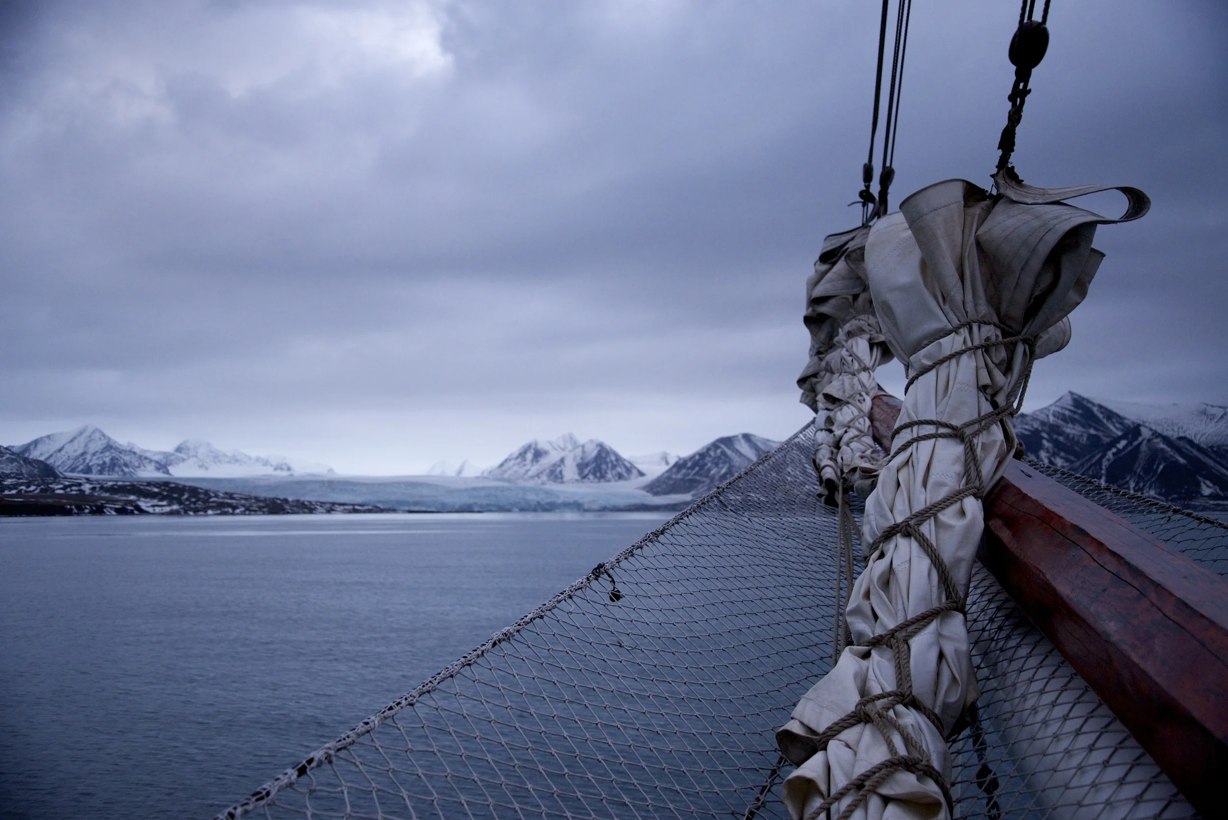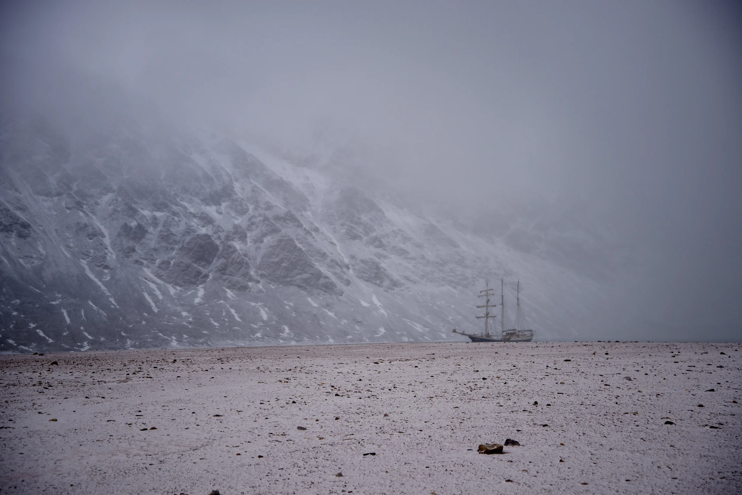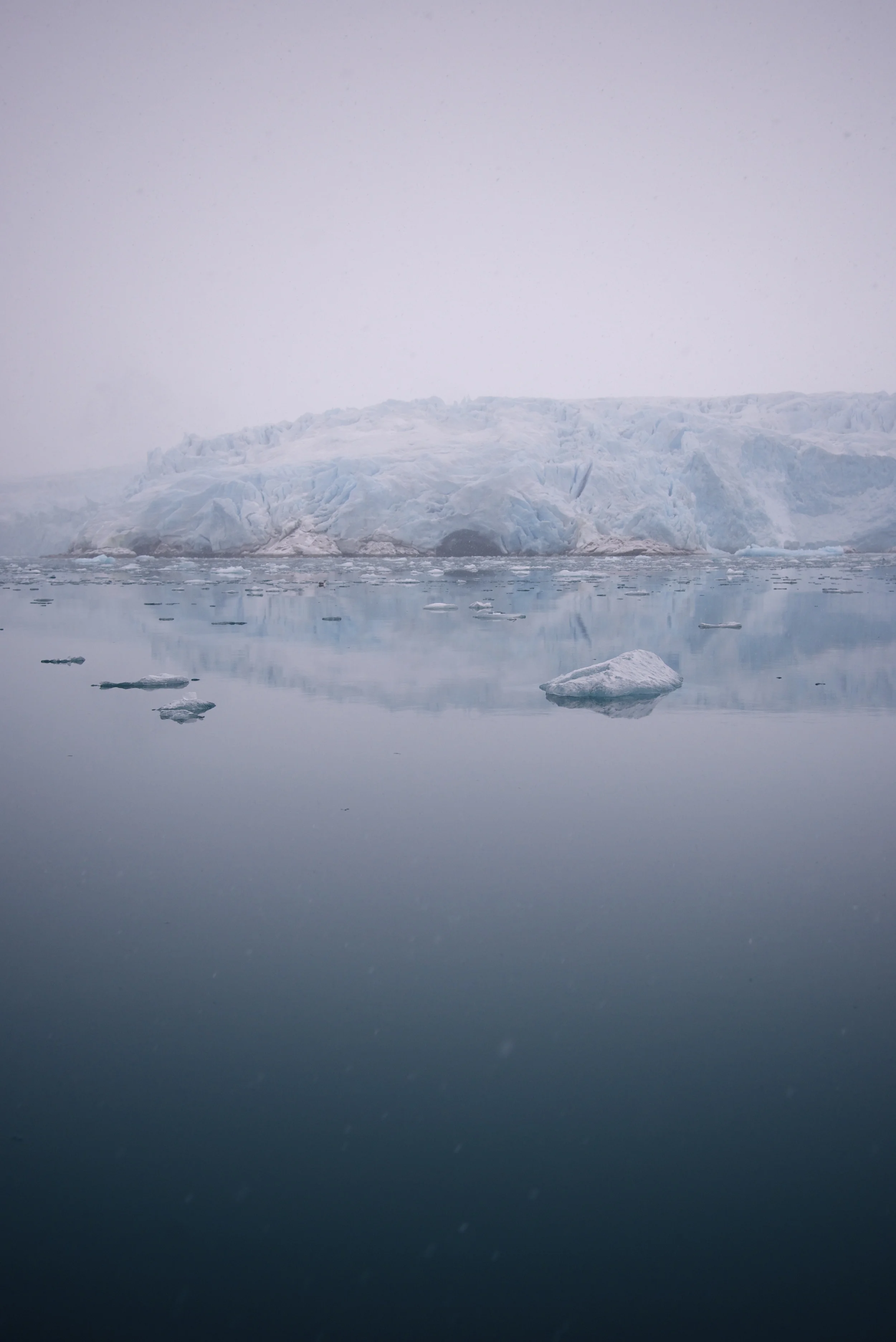 It was clear immediately that the next two weeks are going to be a visual field of expanding and contracting landscapes. As Longyearbyen shrank, the mountains on the facing side of Isfjorden dilated. They were castles of perfectly punctuated patterns of erosion. After a session of learning to rotate ballasts and lower sails and a treacherous crossing of the Isfjorden (ok, not treacherous, but utterly nausea-producing), we made our way into Ymerbukta, a smaller sub-fjord that protrudes from the northern edge of Isfjorden. The light was barely there, but barely is enough to illuminate ice. Esmarkbreen, a massive glacier that crowded the coast in a frozen tumble to the sea, came into focus at the end of the fjord. It was mesmerizing. And it was calving. We glided silently among the floating blocks and slabs and lumps of ice until we were close enough to see a gradient of blue and white, and inky black in its deep fissures. I've never experienced anything like it.