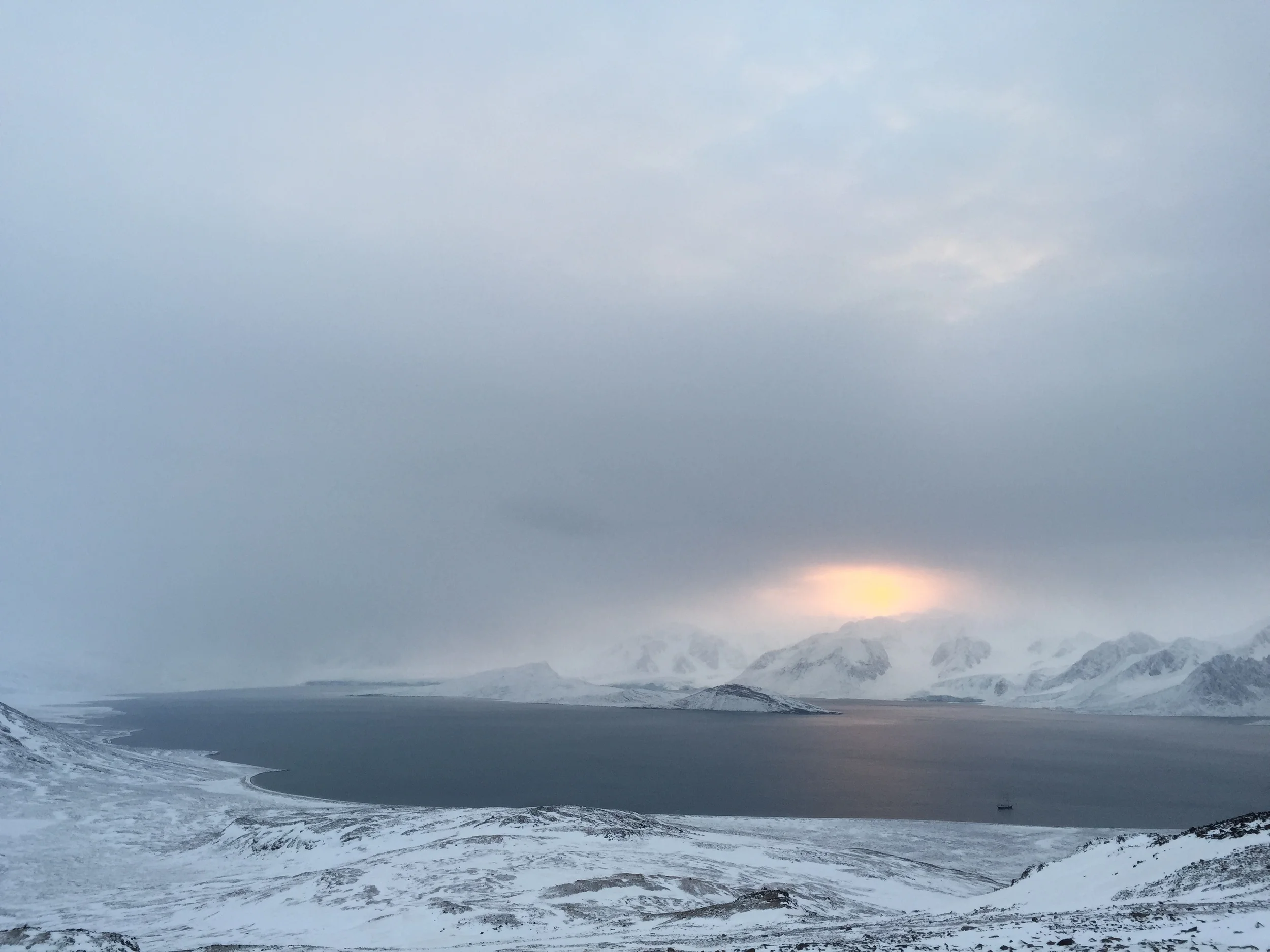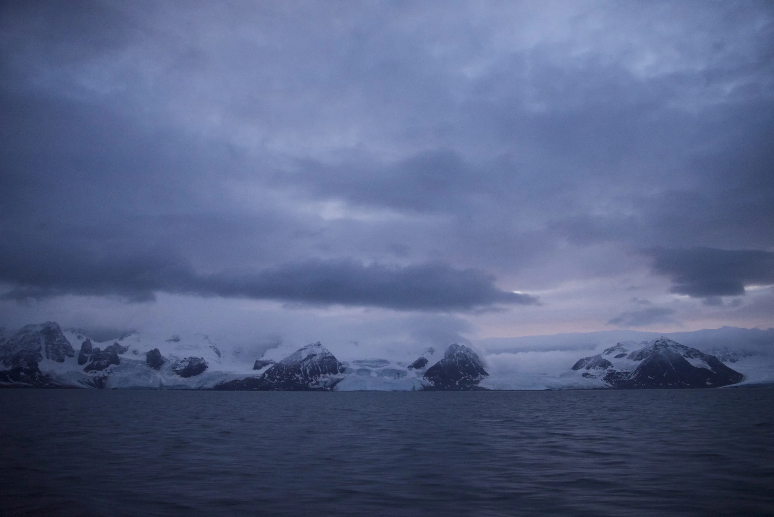 We traveled this morning into the afternoon, continuing to head south until turning back into Krossfjorden and laying anchor in Signehamna. I was happy—the travel left time to have a long nap after breakfast which helped the ferocious head/chest cold that has managed to develop between lack of exercise, lack of sleep, Alex's strange food, stripping down to a mesh bodysuit in the Arctic (part of a project being realized at each landfall) and intense and numerous hot-cold transitions. In the early evening, we made a short landing on a beach covered in deep snow. The mountaintops' contours were rimmed with pink which grew until they were completely lit up in a fiery luminosity behind the Antigua. And it was cold—the coldest it's been so far. When we got in the Zodiac to head back to the ship, we had to use the paddles to break up the ice in the sea and push it away from the propeller.